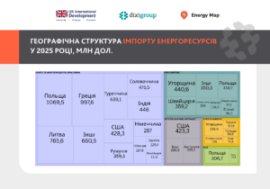 Згідно з даними Energy Map, у 2025 році Україна імпортувала 15 видів паливно-енергетичних товарів* із 69 країн на суму 10,5 млрд дол., що на 1,6 млрд дол. або 18,3% більше, ніж у 2024 році. Надходження від експорту зросли в 2,4 раза – з 0,2 млрд дол. до 0,5 млрд дол.