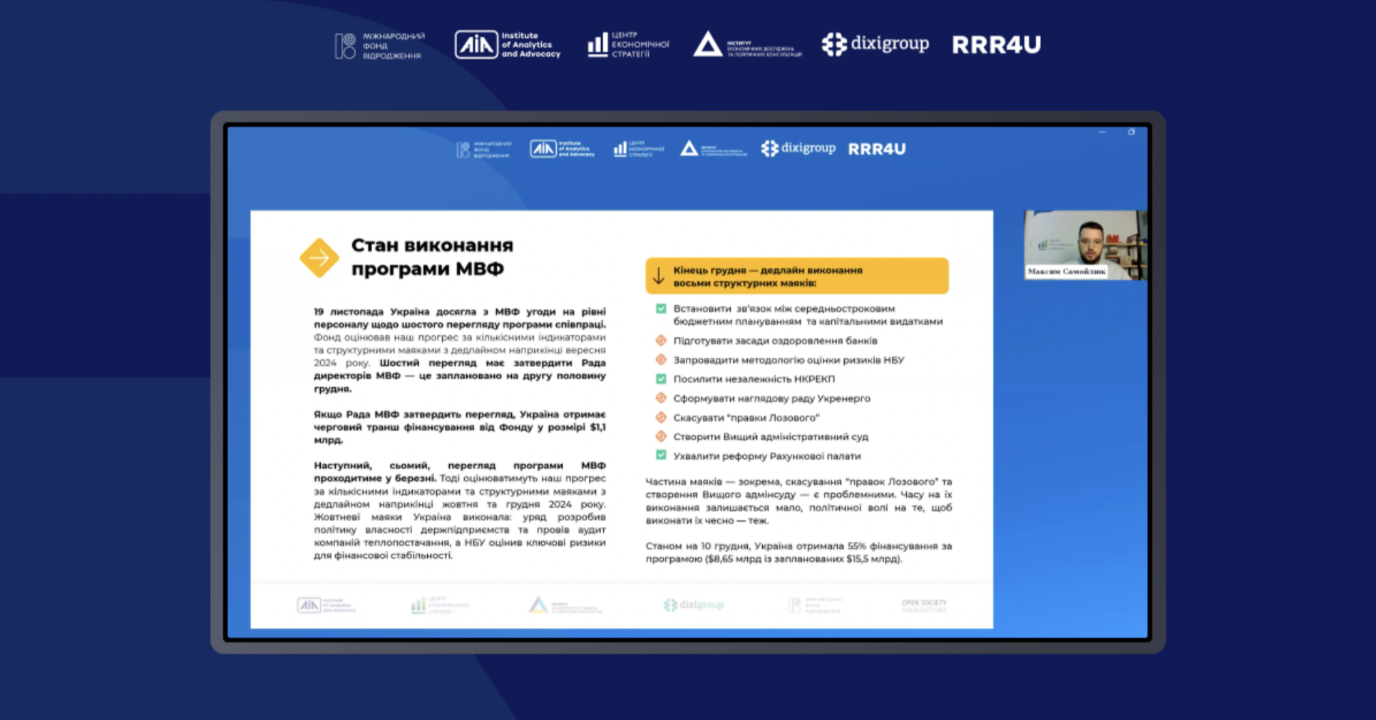 Переглянути запис презентації Моніторингу умов програми МВФ та допомоги ЄС у межах Ukraine Facility можна за посиланням.