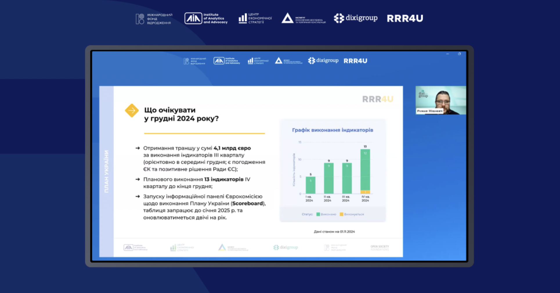“У грудні ми очікуємо надходження коштів, а також планове виконання 13 індикаторів ІV кварталу. А в наступному році ми чекаємо на перевірку та наступний транш. Також Єврокомісія планує запустити дашборд щодо виконання Плану України, що запрацює до січня 2025 року та оновлюватиметься двічі на рік”, – розповів Роман Ніцович, директор з досліджень DiXi Group.