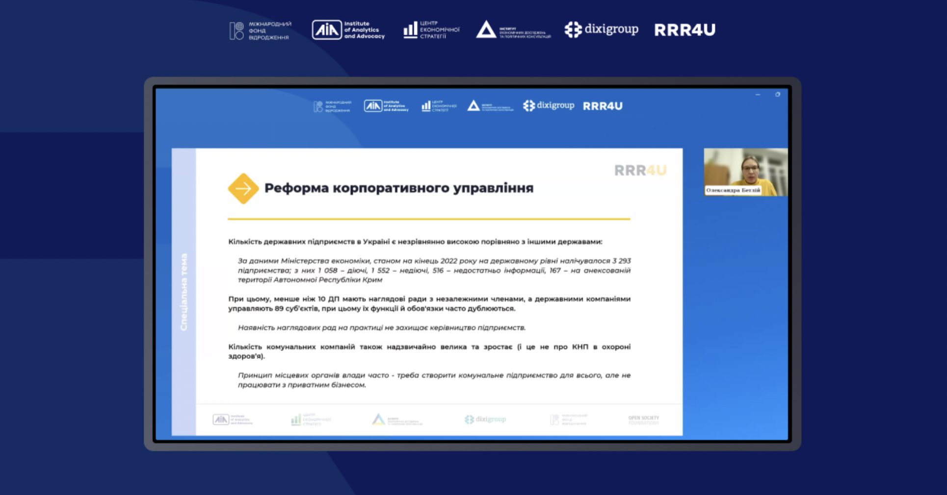Також цього разу експерти детальніше поглянули на реформу корпоративного управління як міжнародне зобов’язання України. Так, фокусі програм МВФ та часто програм макрофінансової допомоги ЄС цій реформі приділяється увага. Це пов’язано з тим, що відсутність ефективного корпоративного управління несе фіскальні ризики, а також сприяє корупції та шкодить розвитку економіки. Сьогоднішні програми підтримки – не виняток.