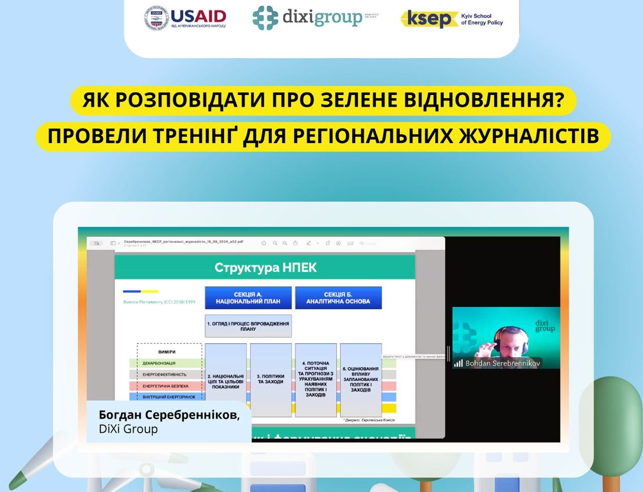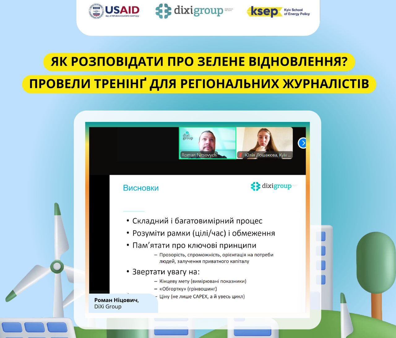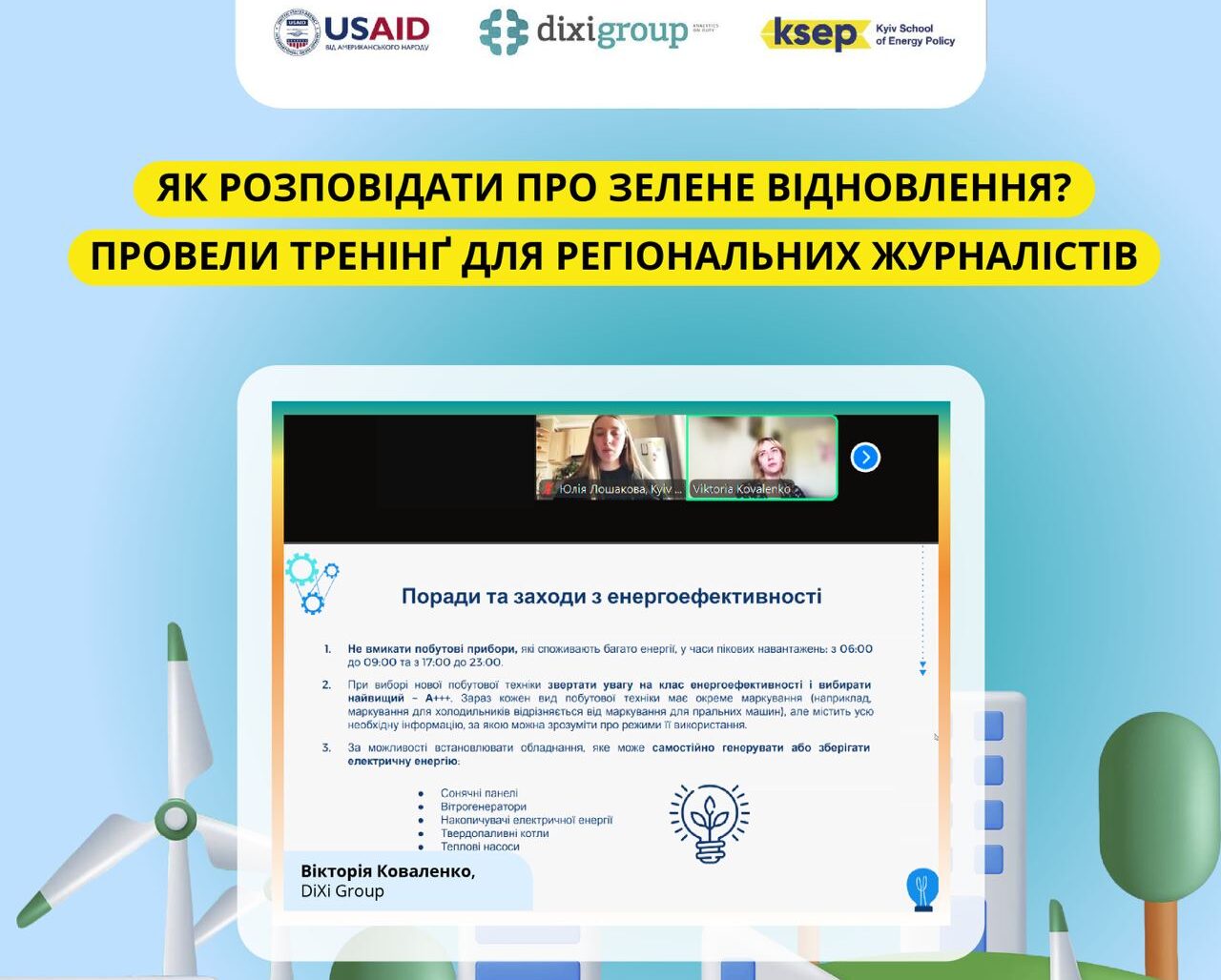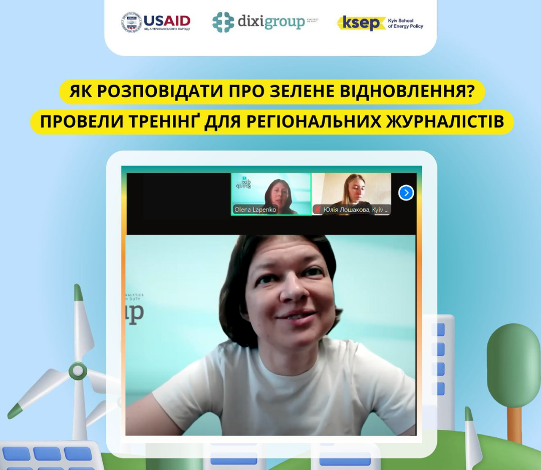 15-16 серпня відбувся дводенний онлайн-тренінг для представників регіональних ЗМІ “Як розповідати про зелене відновлення”. Навчання організовано аналітичним центром DiXi Group спільно з Київською школою енергетичної політики (KSEP) в межах проєкту USAID “Прозорість енергетичного сектору”, який виконує DiXi Group.