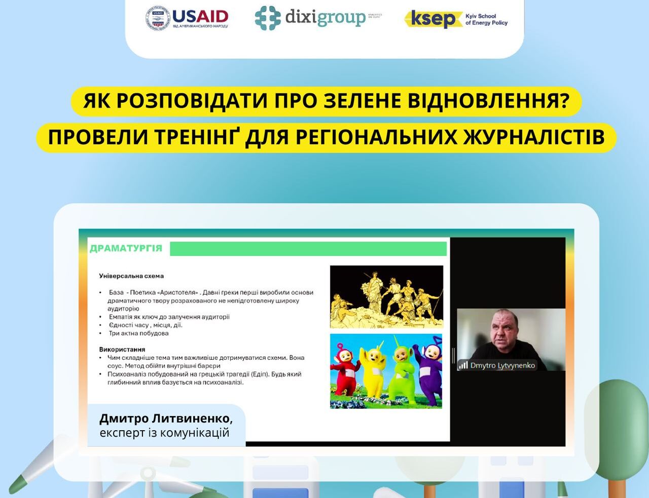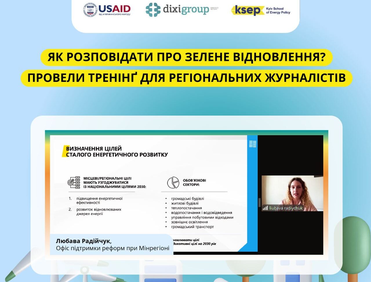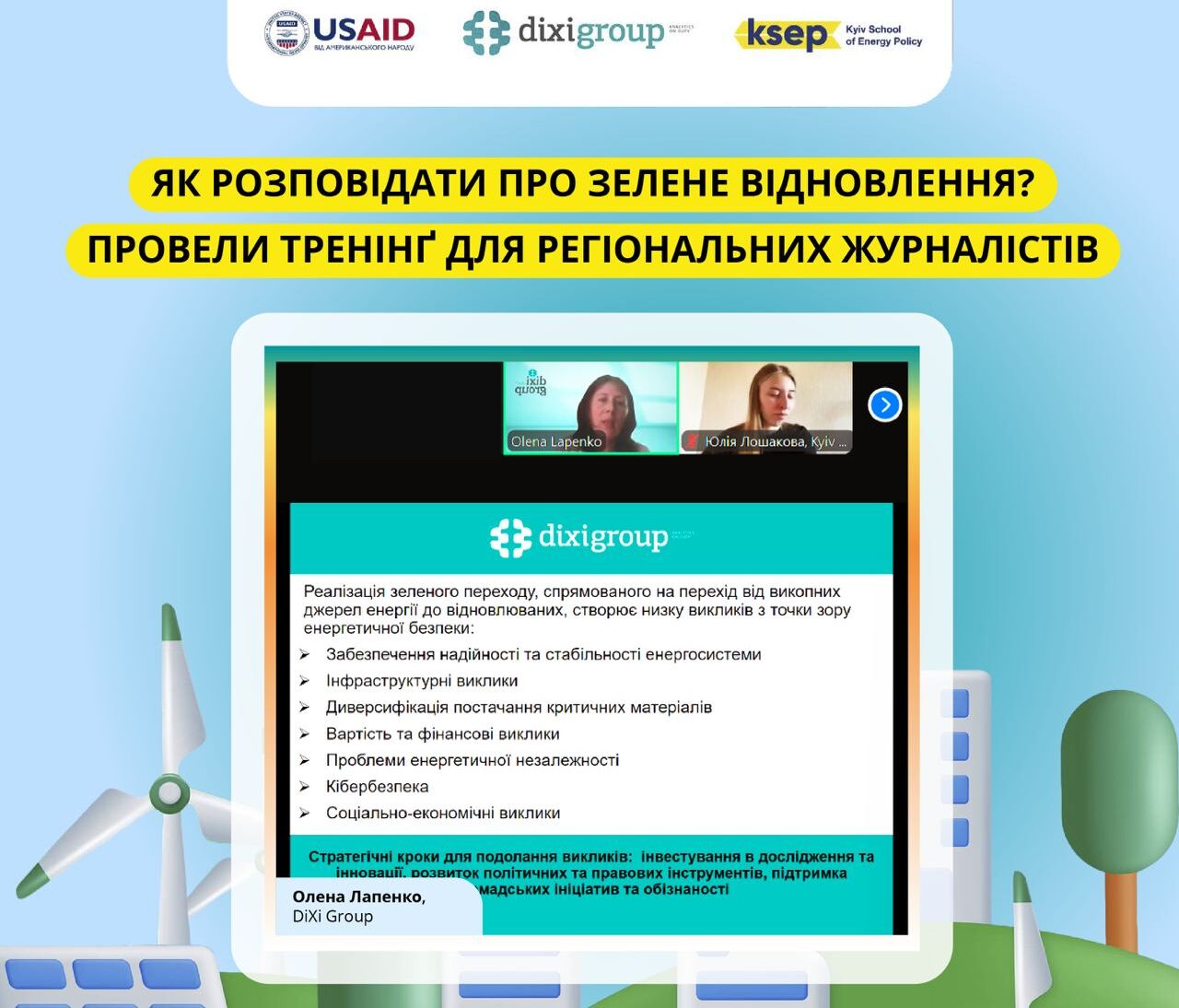 15-16 серпня відбувся дводенний онлайн-тренінг для представників регіональних ЗМІ “Як розповідати про зелене відновлення”. Навчання організовано аналітичним центром DiXi Group спільно з Київською школою енергетичної політики (KSEP) в межах проєкту USAID “Прозорість енергетичного сектору”, який виконує DiXi Group.