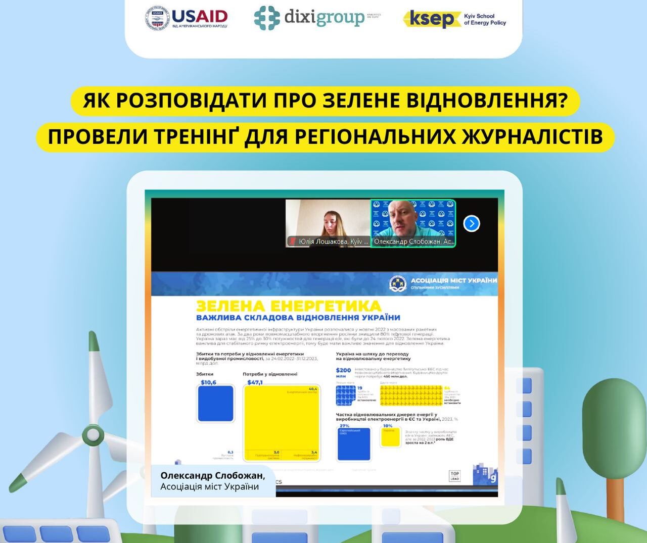 В ході тренінгу виконавчий директор Асоціації міст України Олександр Слобожан, розповів журналістам, якою є роль громад у зеленому відновленні. Виконавчий директор переконаний, що будь-якій із українських громад цілком до снаги реалізувати зелене відновлення. Визначальними для цього є два фактори: фінансовий і кадровий. Якщо з цими викликами вдасться упоратися, досягнемо успіху.