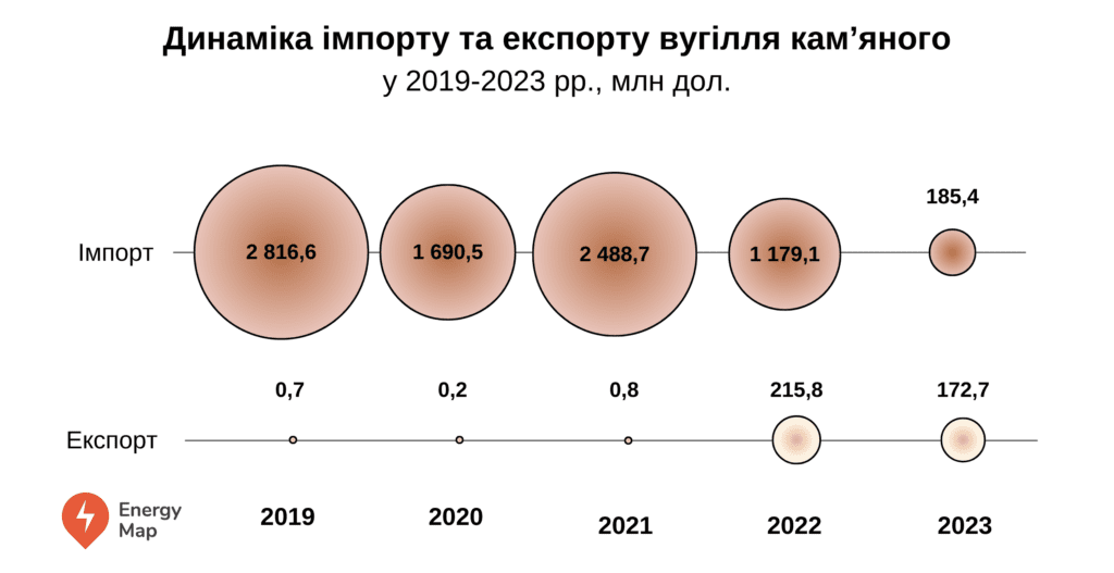 Імпорт кам’яного вугілля у 2023 році було суттєво зменшено: 0,7 млн тонн проти 4,6 млн тонн у 2022 році та 19,6 млн тонн у 2021 році. Витрати на закупівлю вугілля склали 185,4 млн дол., що нижче у понад 6 разів порівняно із 2022 роком та у понад 13 разів – з 2021 роком. Імпорт здійснювався з 13 країн, три з яких – Польща, США та Австралія – забезпечили 82% ресурсу.