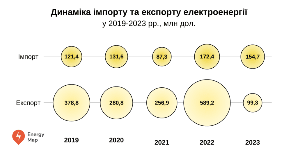 У 2023 році Україна експортувала 366,5 тис. МВт·год електроенергії вартістю 99,3 млн дол. Обсяг експортних надходжень зменшився у 6 разів порівняно з 2022 роком та майже в 3 рази – порівняно з 2021 роком. Основна причина – російські ракетні обстріли енергетичних об’єктів, внаслідок яких Україна призупинила експорт електроенергії з жовтня 2022 року та відновила його в значно менших обсягах у квітні 2023 року.