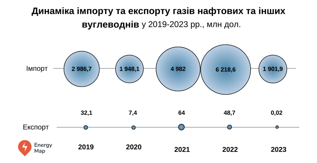 У 2023 році Україна суттєво скоротила обсяги закупівель газу природного, скрапленого (пропану або суміші пропану з бутаном) та інших газів, закупивши 1,8 млн тонн за ціною 1,9 млрд дол., що на 81% менше ніж у 2022 році (9,5 млн тонн) та на 80% – ніж у 2021 році (9,1 млн тонн).