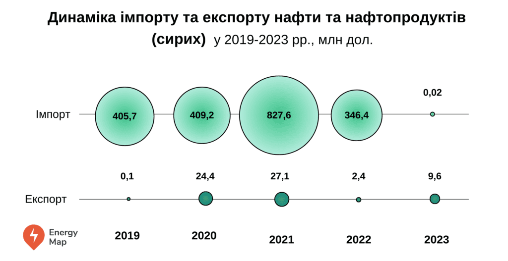 У 2023 році Україна зменшила практично до нуля імпорт сирих нафти та нафтопродуктів: обсяг закупівель склав 26 тонн на суму 22 тис. дол., тоді як протягом двох попередніх 2022 та 2021 років вартість імпорту становила 346,4 та 827,6 млн дол., відповідно.