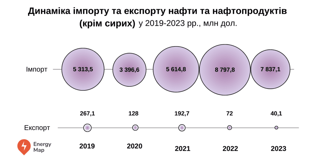 У 2023 році нафтопродуктів не сирих (переважно дизелю та бензинів) було імпортовано 7,6 млн тонн загальною вартістю 7,8 млрд дол. У 2022 році обсяг імпортованого палива був менший – 7,3 млн тонн при більших витратах – 8,8 млрд дол. У 2021 році було імпортовано 8,8 млн тонн нафтопродуктів вартістю 5,6 млрд дол.